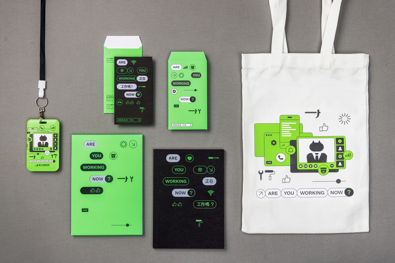 主視覺一反藝術展覽視覺手法,創造與展出作品呼應的貓型上班族,以趣味詼諧的風格,借用傳統勞動器具,與熟悉的wifi、通話、按讚、追蹤、線上會議介面按鈕,重現從虛擬世界滿溢而出、資訊爆炸的一日工作環節。選用帶有螢光感的綠色除了更貼近電腦螢幕顯色外,也呼應機械設備開機啟動、正常運行的綠色燈號,和在資本主義之下時刻在線的勞工。