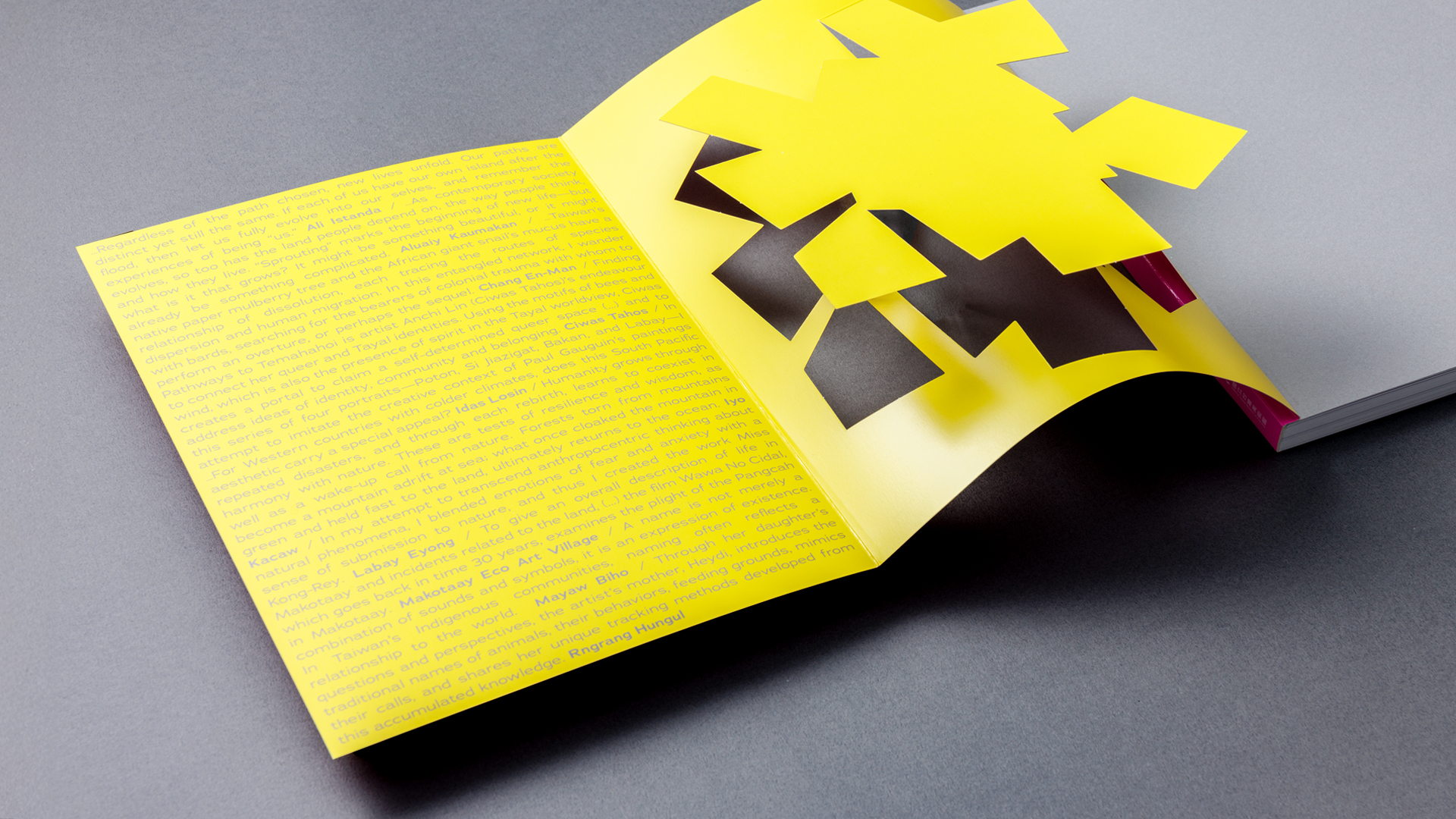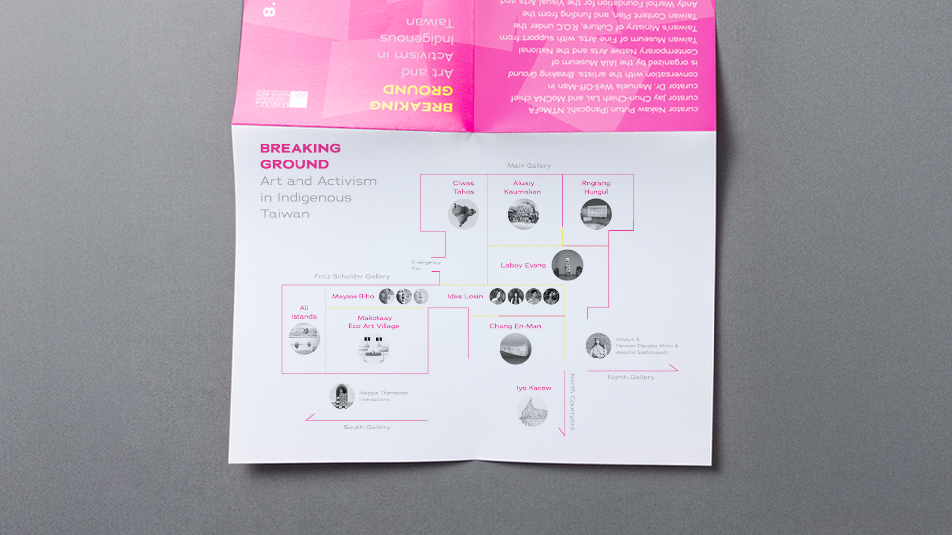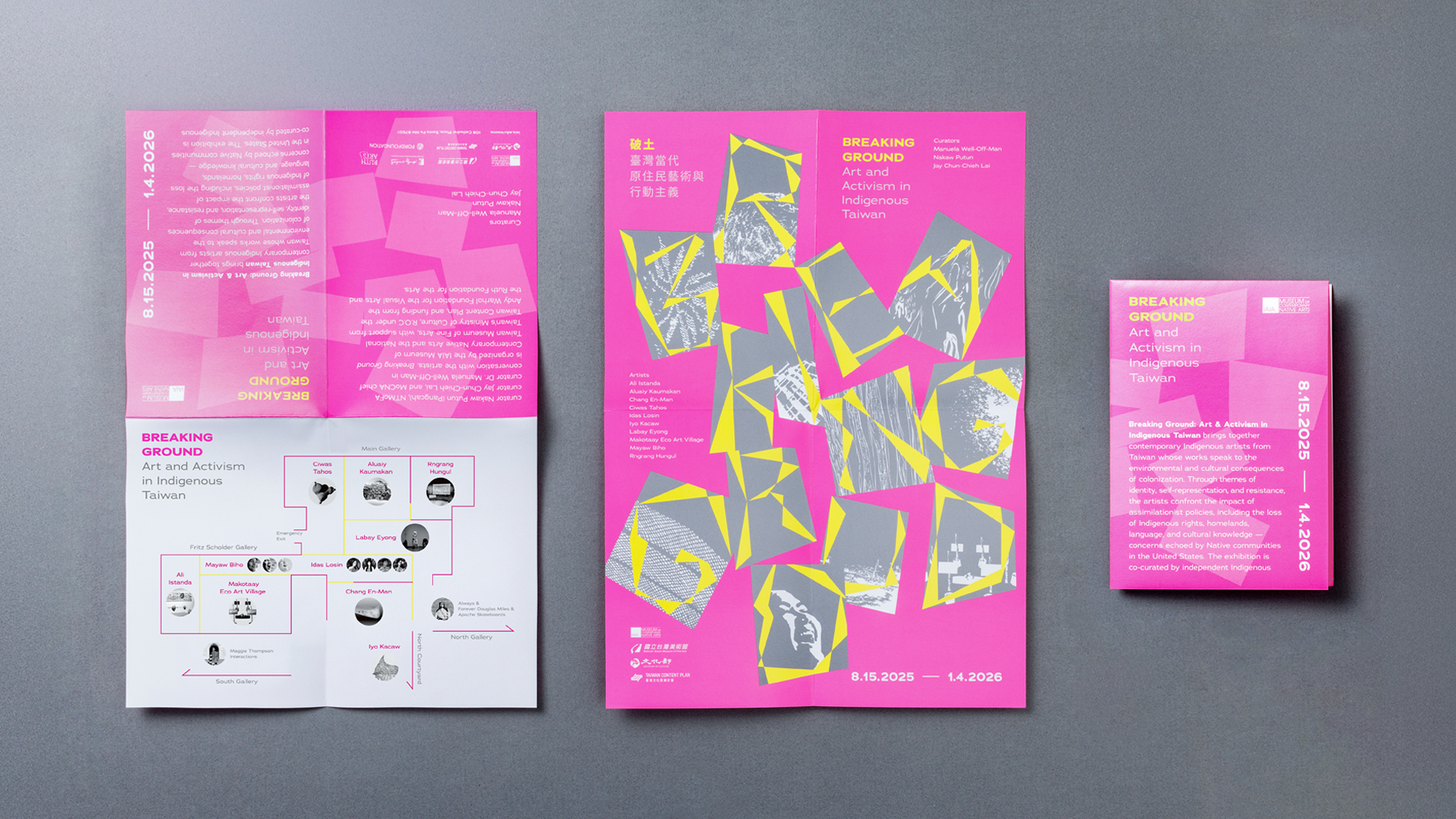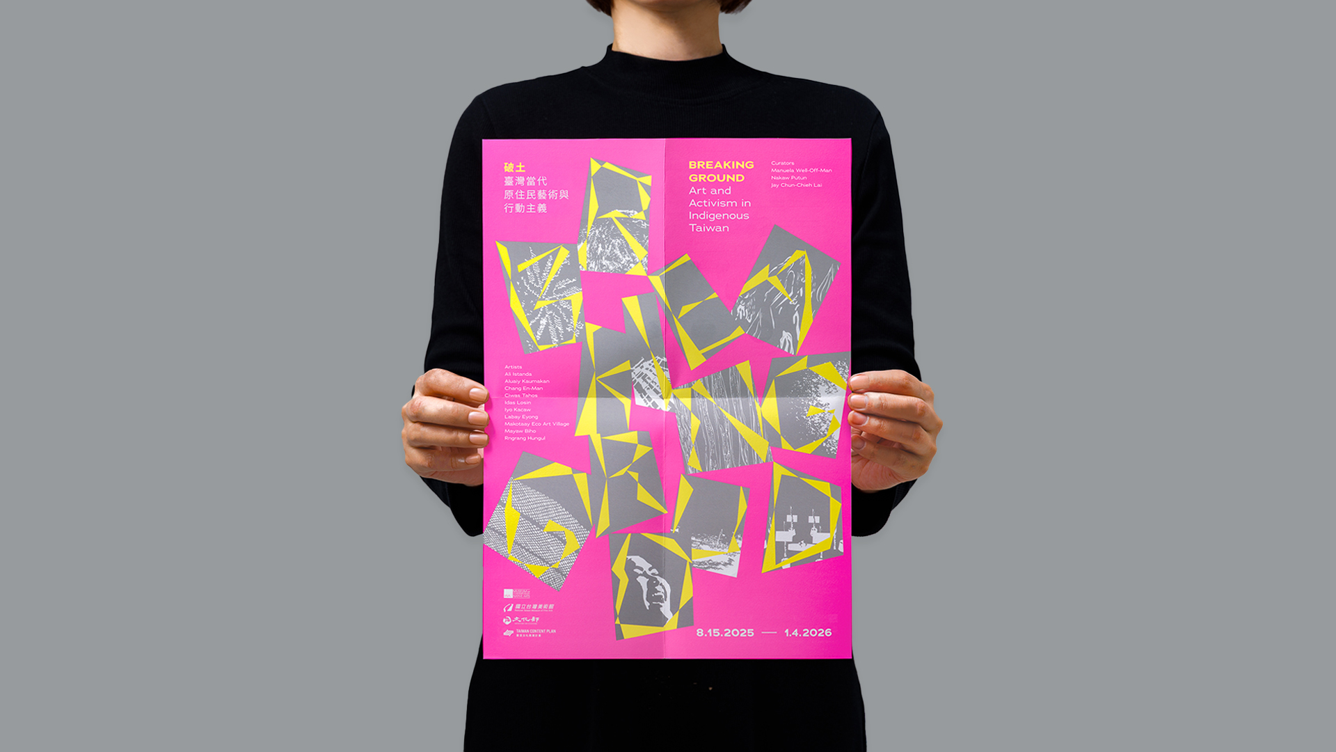主視覺以特別打造的斷裂字體與作品圖像層疊,形塑出渴望破格的張力,象徵原住民族的抵抗精神與行動主義——打破界線、重拾身分認同,並開啟新的對話。自作品中擷取大膽鮮明的桃紅與鮮黃色,作為本次展覽的代表色。