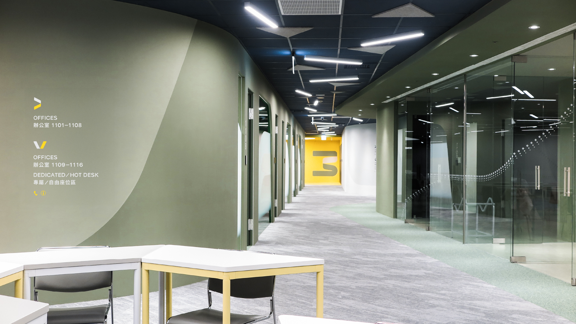 導引結構依使用情境劃分為三個層級:入口與公共區域導引、區域分流,以及座位與功能區導航,並以巨型數字編碼分類功能區域,提升辨識效率。色彩上以紅色系標示 VIP 區,黃與綠色系呈現新創辦公區的活力,輔助搭配中性的灰藍色,強化區域識別。